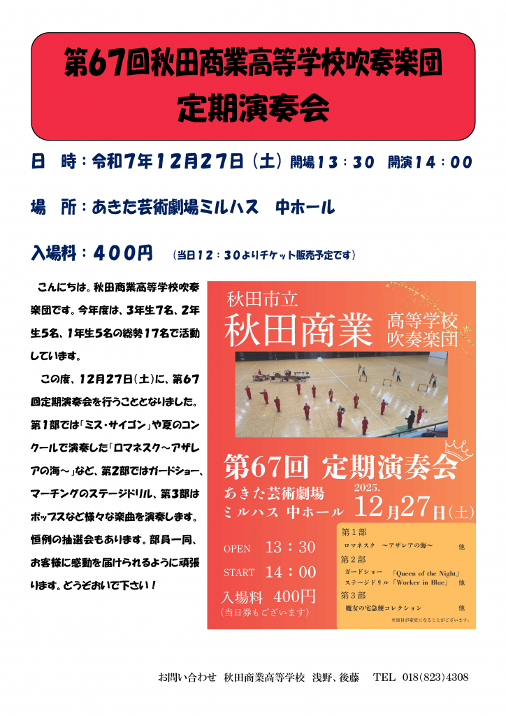 第67回秋田商業高等学校吹奏楽団定期演奏会のお知らせ
